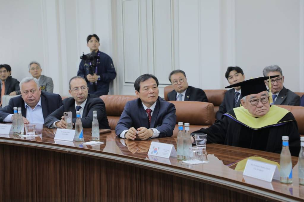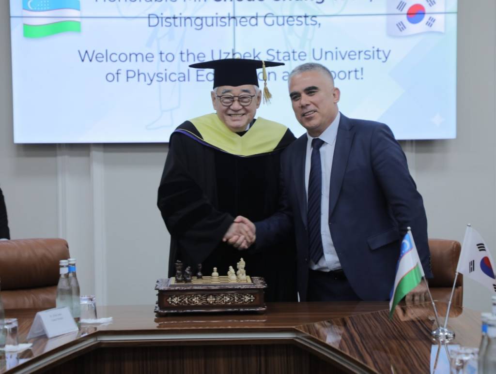 Ўзбекистонлик спорт таълими мутасаддилари, олимлар билан ўтказилган мулоқот жараёнида World Taekwondo раҳбари Чунгвон Чойга университетнинг “Фахрий доктори” унвони топширилди.